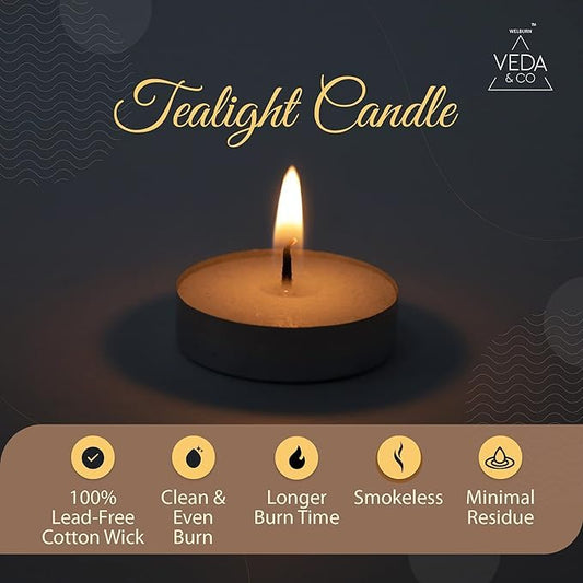 Welburn Veda&Co® Wax Unscented Tealight Candles Pack of 100 for Diwali Decoration | Long Burning | Paraffin Free & Smokeless | Candles for Home Decor, Offices, Dining & Special Occasions