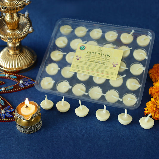 Pure Cow Ghee Batti for Puja - 30 Pieces, Ghee Batti with Cotton Wick, 30 Min Burn Time, Ghee Blended Diyas, One Month Pack, for Home & Temple