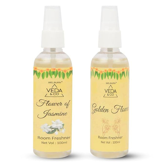 Room Freshener for Puja - Combo Pack of 2 (100ml each) | Jasmine & Golden Flower Fragrance | Long Lasting Air Freshener for Home & Office
