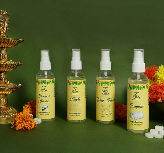 Room Freshener for Puja - Combo Pack of 4 (100ml each) | Jasmine, Camphor, Golden Flower & Temple Fragrance | Long Lasting Air Freshener for Home & Office