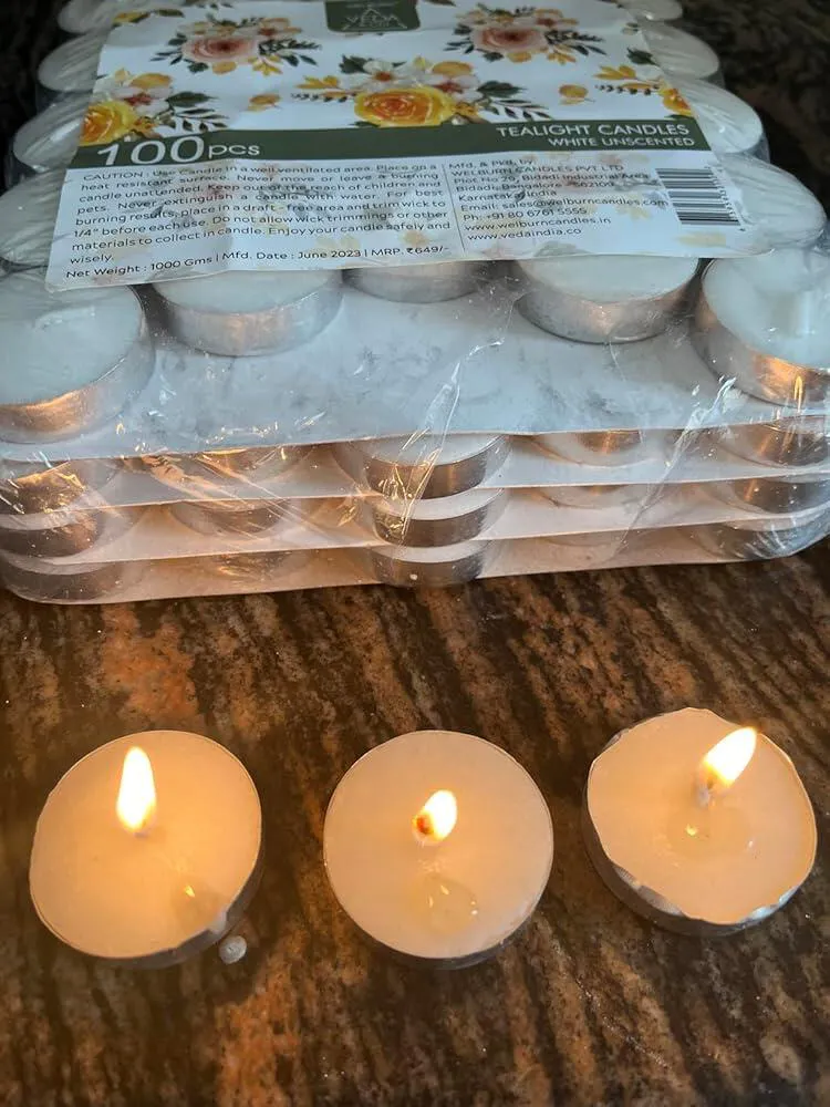 Wellburn tea light candles are smokeless and odourless candles , leaves no residue behind , burn time is around 3 hours and burns very evenly , packaging is very attractive, must buy for all ….